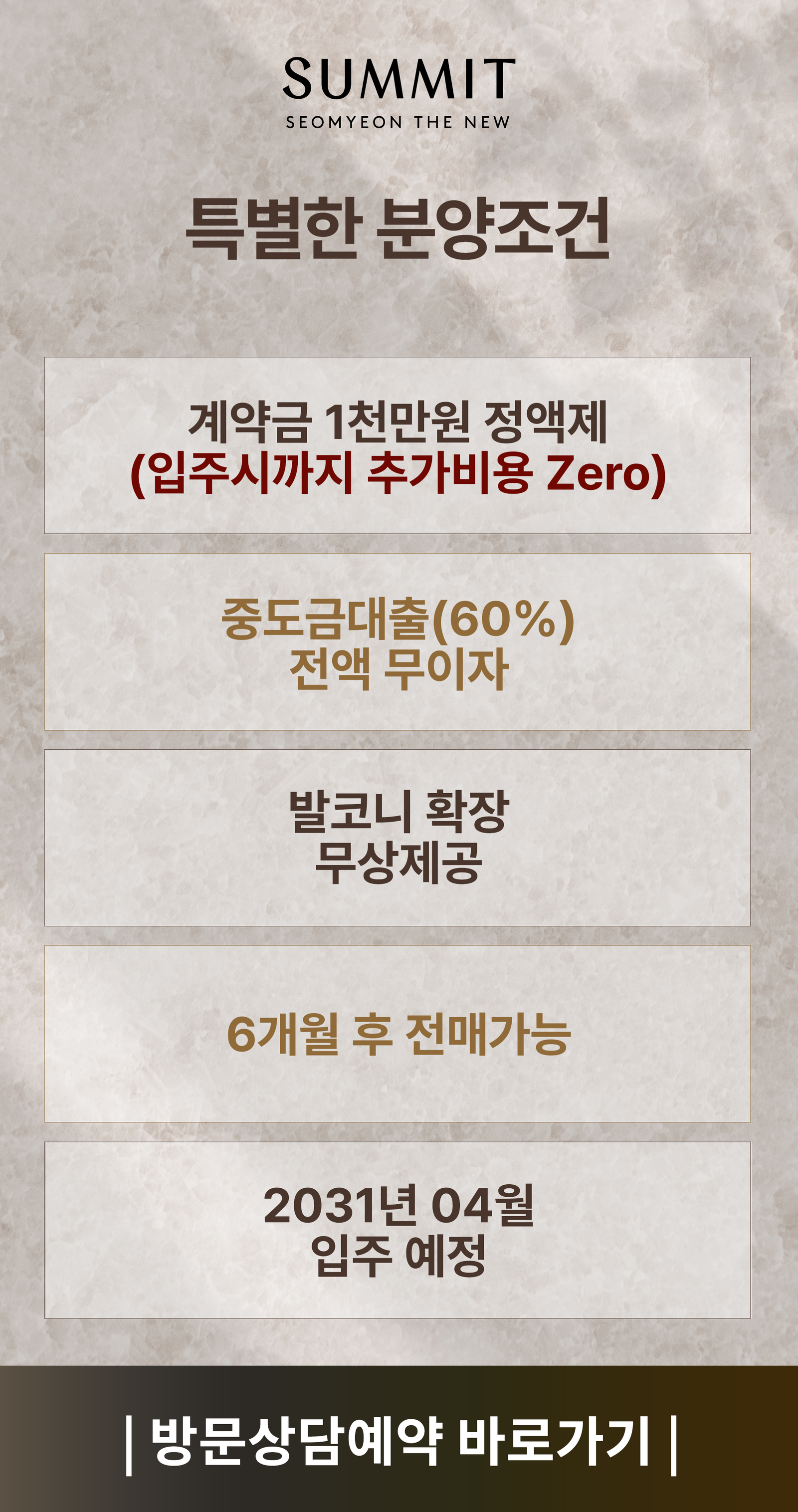 서면 써밋 더뉴 방문예약 고객의 개인정보를 수집합니다. 수집한 개인정보는 방문예약 이외의 목적으로는 사용하지 않으며, 모집 기간 완료 후 즉시 파기합니다. 개인정보의 수집 및 이용에 대한 동의를 거부할 수 있으며, 이 경우 방문예약 접수가 어려울 수 있습니다.